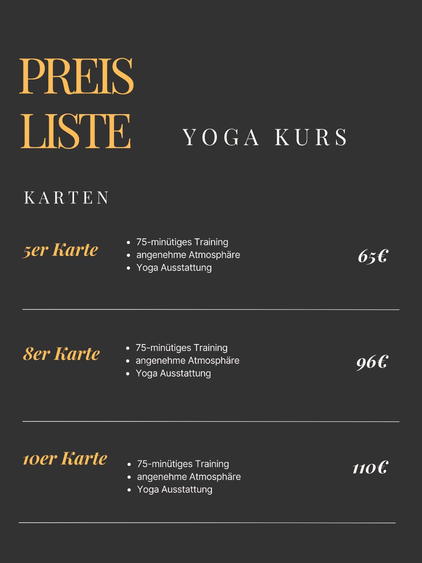 Mit der 5-er, 8-er oder 10-er Karte kannst du dich flexibel über das eversports Stundenplan einbuchen. Die Yogakurse finden in Kleingruppen mit maximal 14 Teilnehmern statt, um eine qualitativ hochwwertige Betreuung und individuelle Korrekturen zu gewähleiten.