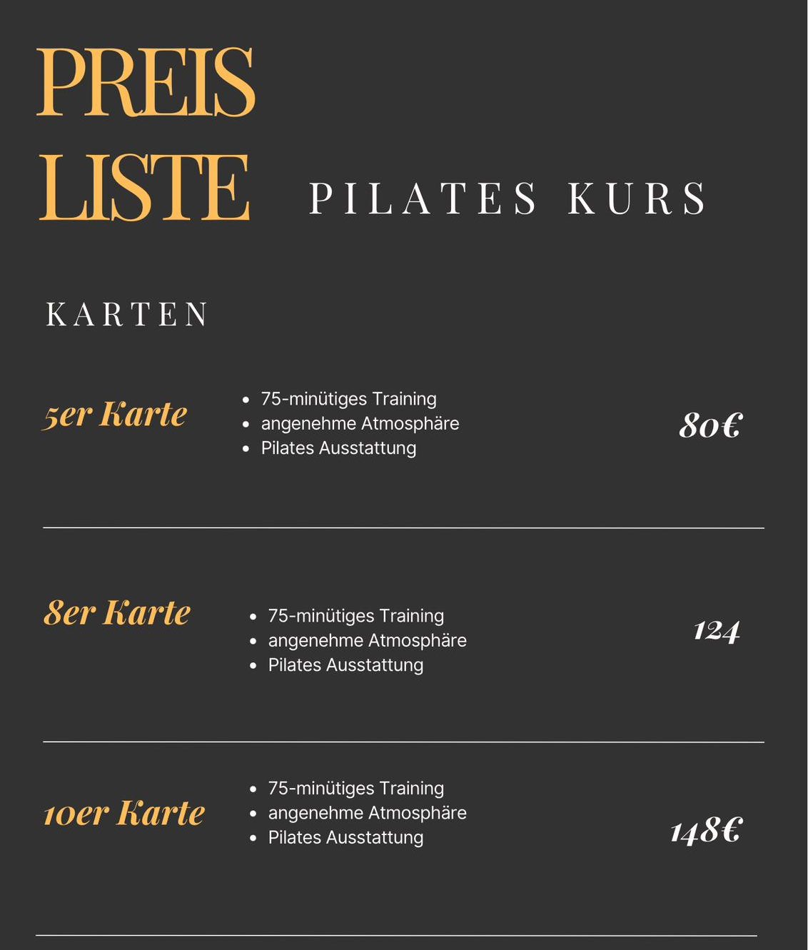 Mit der 5-er, 8-er oder 10-er Karte kannst du dich flexibel über das eversports Stundenplan einbuchen. Die Pilateskurse finden in Kleingruppen mit maximal 14 Teilnehmern statt, um eine qualitativ hochwwertige Betreuung und individuelle Korrekturen zu gewähleiten.